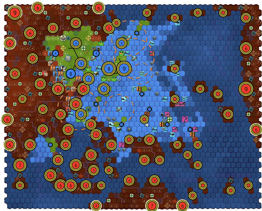 It goes without saying that the map has been twisted and bend two make it sense for the flow of the game and for the AI (the poor thing struggled to get its fleets through the narrow windy waterways). Plus some of the most fragmented areas has been merged into one block of land because otherwise so much of the 'land' would be just scattered singular hexagons. Having any sort of battles featuring maneuvering with just one or two hexagons is silly. Usually scenarios in this game series use names of cities, but in this particular campaign city-names have been replaced with the names of the bigger islands or countries or 'logical' areas. For example: Okinawa, Guam, AUS E (Australia E), Coast N (Northern Chinese Coast). While most bigger islands are grouped under one name, 'Philippines W' turned out to be too long name for the older budget phones, so the Philippines is represented with various shorter names of the main islands. Manchu is shortened for similar reasons.