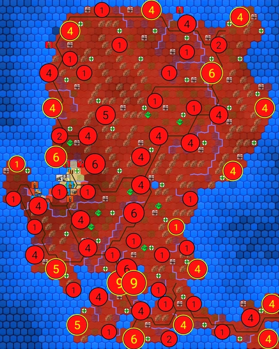 QUICK TIPS: Settings: You can change hexagon size, city icons, unit icons, and many other aspects from settings, or via the four round buttons in the upper-left corner of the gaming view. Unit markings: Lower left corner shows HPs (Hit Points), upper left corner shows the number of MPs (move points), right side has several type of markings: warnings on red, attached resources on white, ground information (what's under unit icon) is marked on green. Zooms buttons (Z) are located on upper-left corner. Combat core concepts: adjacent units critically support each other in battle: encircling is often more efficient than using brute-force direct attacks. TMP-system: By controlling Key Tactical Locations (green diamonds) you will gain TMPs (Tactical Move Points), which can be used to move between two hexagons sharing Tactical Route (yellow-green arrow between the hexagons) without losing regular MPs.