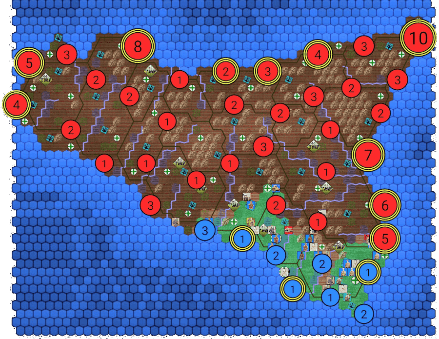Victory Conditions: Control over 100 Victory Points (VPs), which are gained from the cities. A total of 110 Victory Points available in this particular campaign.