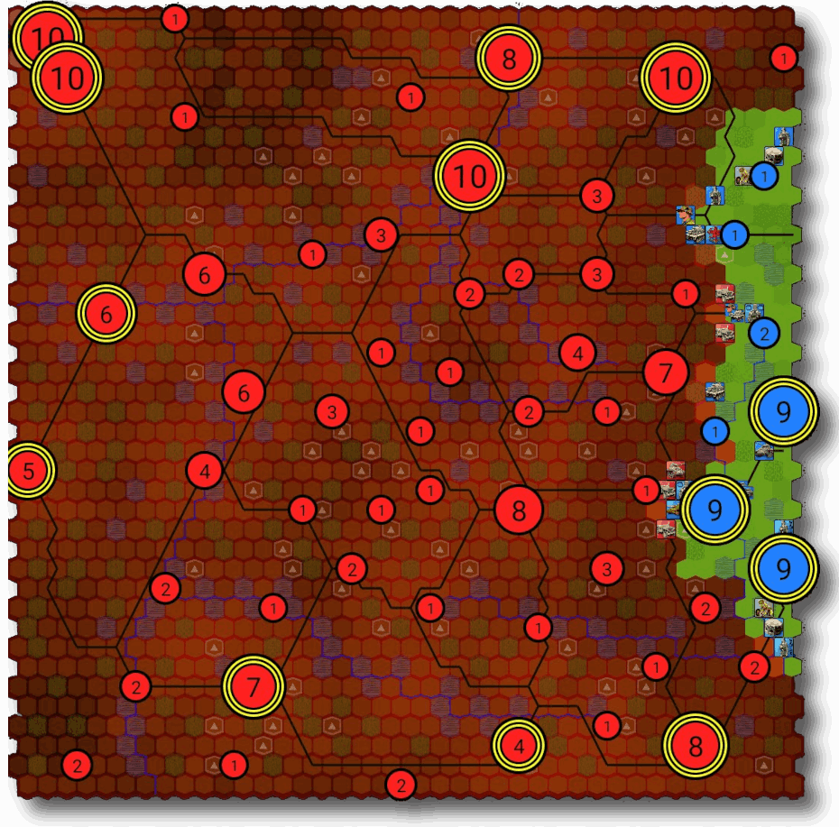 To keep the flow of the play fluid this campaign does not feature physical support units (Generals, Artillery, etc.), instead Stuka Strikes are available as resources (after the turn 9).