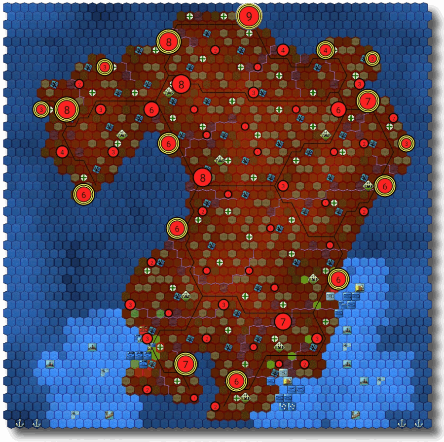 Terrain and map: Some of the most uneven rugged coastal features have been smoothed out. Forest are marked with palm trees to maintain unified look among Pacific campaigns.