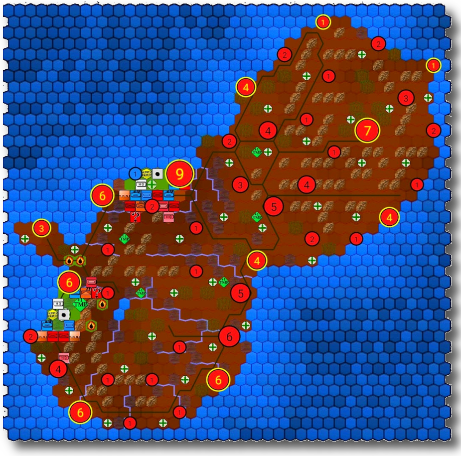 QUICK TIPS: Settings: You can change hexagon size, city icons, unit icons, and many other aspects from settings, or via the four round buttons in the upper-left corner of the gaming view. Unit markings: Lower left corner shows HPs (Hit Points), upper left corner shows the number of MPs (move points), right side has several type of markings: warnings on red, attached resources on white, ground information (what's under unit icon) is marked on green. Zooms buttons (Z) are located on upper-left corner. Combat core concepts: adjacent units critically support each other in battle: encircling is often more efficient than using brute-force direct attacks. TMP-system: By controlling Key Tactical Locations (green diamonds) you will gain TMPs (Tactical Move Points), which can be used to move between two hexagons sharing Tactical Route (yellow-green arrow between the hexagons) without losing regular MPs.