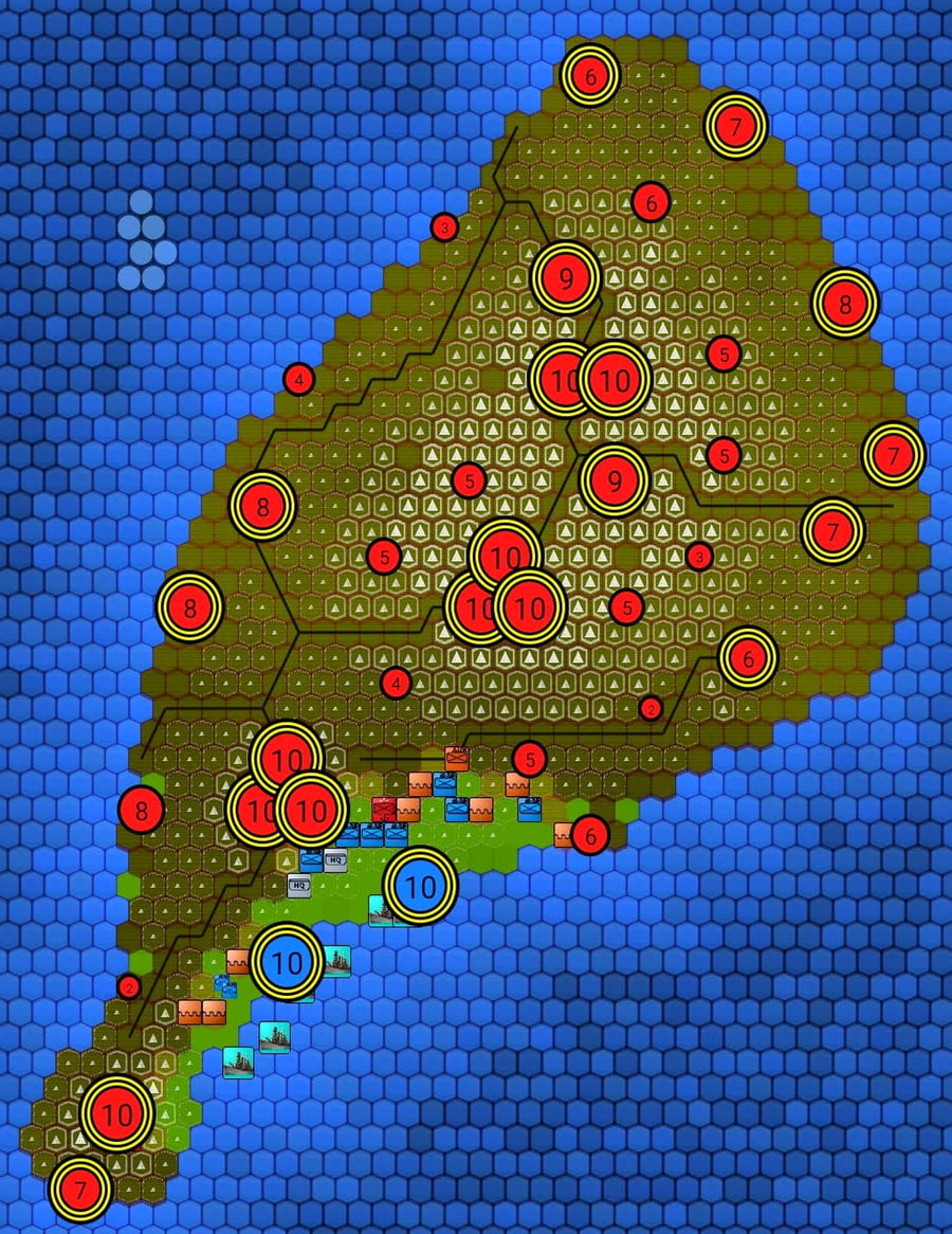 MOVE-COSTS: Moving via a road costs 1 MP (both hexagons must have road), any other movement costs 2 MPs. Going uphill costs 1 extra MP, except for a tank unit which loses 2 extra MPs. Using Tactical movement routes (hexagons connected by yellow-green arrows) costs 1 regular MP LESS but you lose 1 Tactical MP (TMP). Movement cost can never be less than 1 MP.