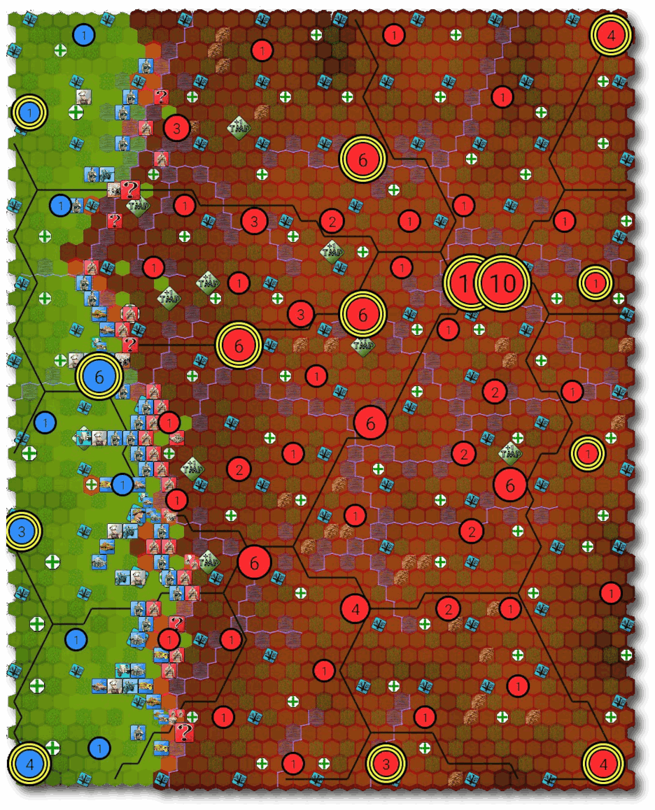 QUICK TIPS: Combat core concepts: adjacent units critically support each other in battle; encircling is often more efficient than using brute-force direct attacks. Unit markings: Lower left corner shows HPs (Hit Points), upper left corner shows the number of MPs (move points), right side has several type of markings: warnings on red, attached resources on white, ground information (what's under unit icon) is marked on green. Zooms buttons (Z) are located on upper-left corner. TMP-system: By controlling Key Tactical Locations (green diamonds) you will gain TMPs (Tactical Move Points), which can be used to move between two hexagons sharing Tactical Route (yellow-green arrow between the hexagons) without losing regular MPs. Settings: You can change hexagon size, city icons, unit icons, and many other aspects from settings, or via the four round buttons in the upper-left corner of the gaming view.