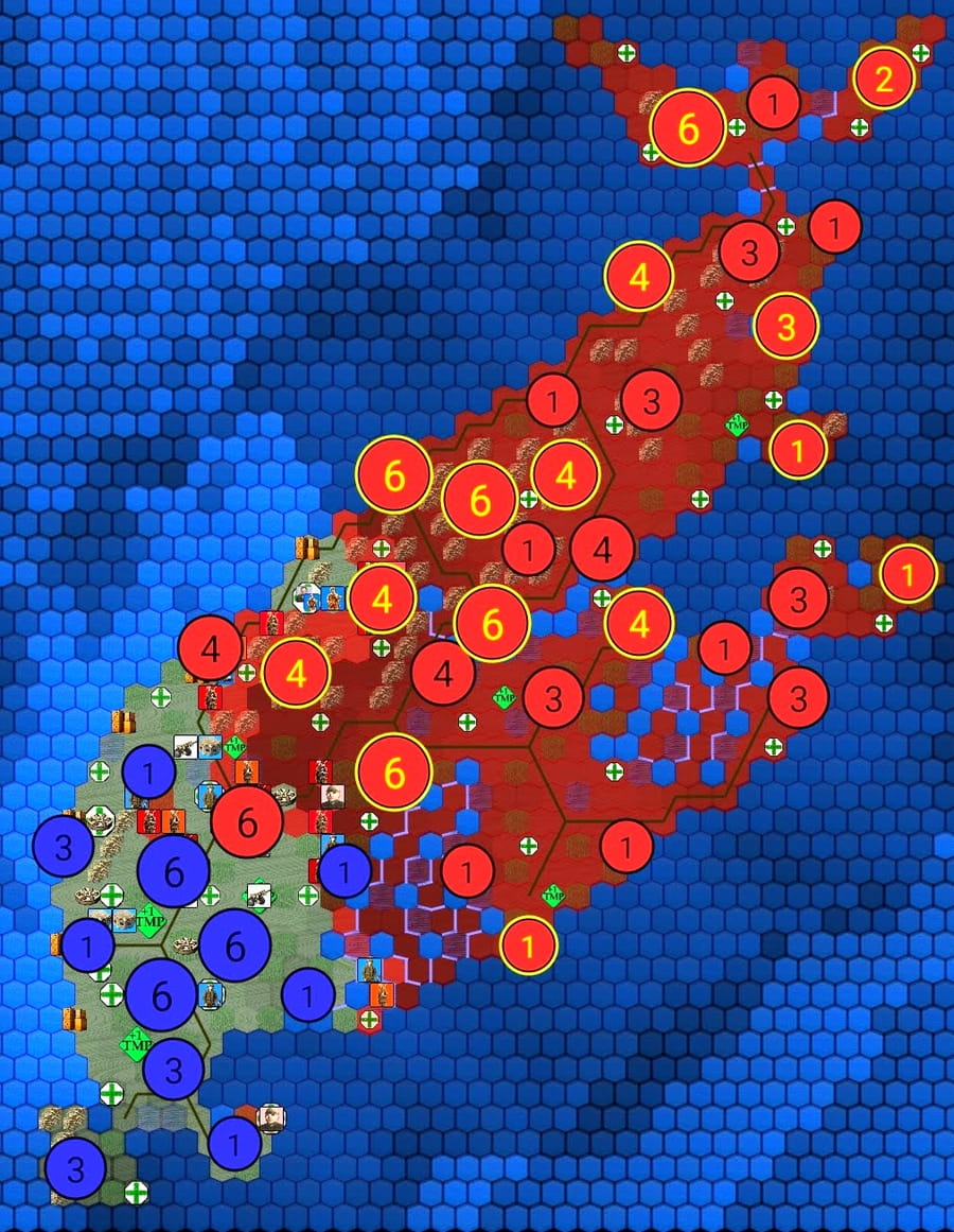 QUICK TIPS: Settings: You can change hexagon size, city icons, unit icons, and many other aspects from settings, or via the four round buttons in the upper-left corner of the gaming view. Unit markings: Lower left corner shows HPs (Hit Points), upper left corner shows the number of MPs (move points), right side has several type of markings: warnings on red, attached resources on white, ground information (what's under unit icon) is marked on green. Zooms buttons (Z) are located on upper-left corner. Combat core concepts: adjacent units critically support each other in battle: encircling is often more efficient than using brute-force direct attacks. TMP-system: By controlling Key Tactical Locations (green diamonds) you will gain TMPs (Tactical Move Points), which can be used to move between two hexagons sharing Tactical Route (yellow-green arrow between the hexagons) without losing regular MPs.